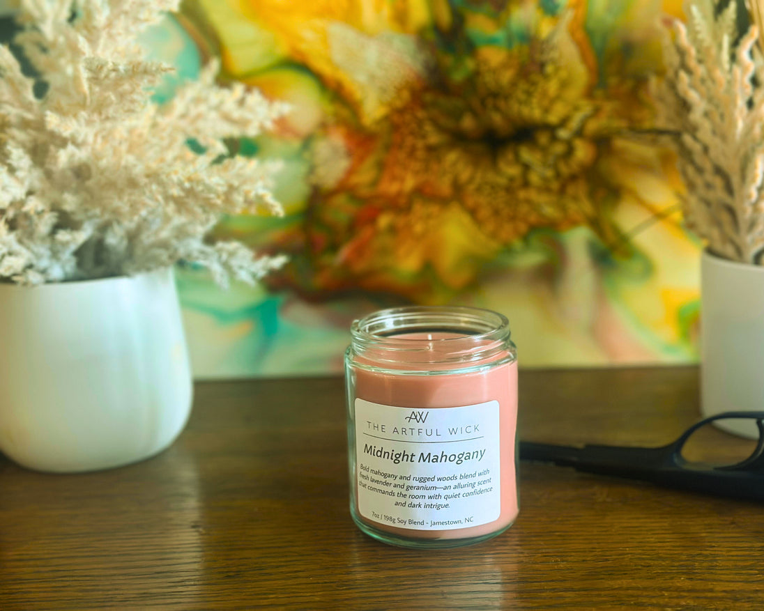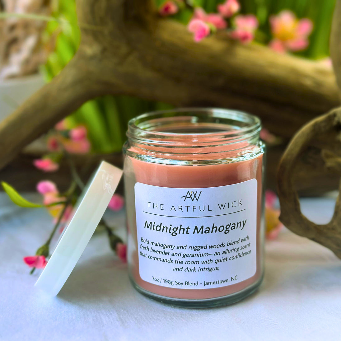 Bold mahogany and rugged woods blend with fresh lavender and geranium—an alluring scent that commands the room with quiet confidence and dark intrigue.